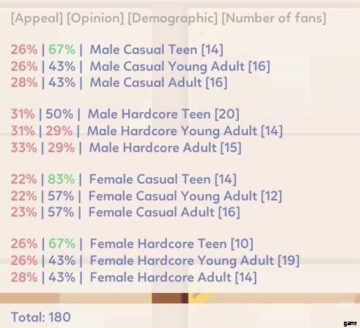 各アイドル統計は 2 つの特定の人口統計に対応しており、シングルを作成する際の選択肢と組み合わせて、全体的な人口統計上の魅力を決定します。特定の人口統計をターゲットにして、その満足度を維持することで、シングル、売り上げ、コンサートへの出席などからファンを増やすことができます。アピールに一貫性がないと、不幸が生じ、人口統計グループの意見が低くなります。
