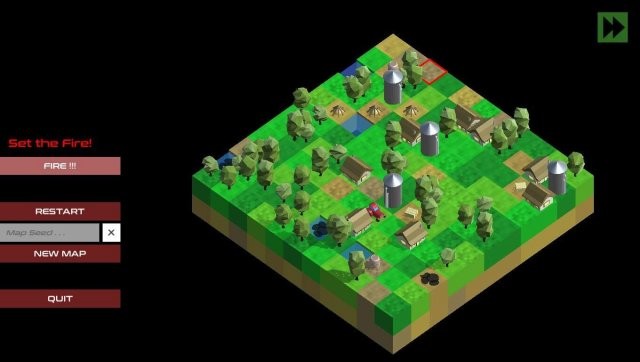 ファイア プレイの最後に、ゲームは、燃えたタイルの割合などの統計を表示します。ランダムなマップでパーセンテージを取得するか、これに適したマップをロードすることができます。メイン メニューで [再生] をクリックし、シード番号を [マップ シード] ボックスに配置し、[新しいマップ] をクリックしてロードします。コミュニティが使用する良いシードは 713374931 で、以下の itens の配置がありますが、火が確実に、または決定論的に広がるわけではないため、大きな問題があることに注意してください。独自のアイテム配置でクリエイティブに。