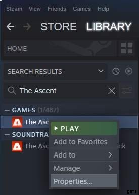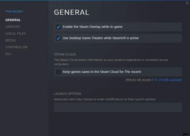 Steam ゲーム ライブラリで The Ascent を右クリック -> プロパティを左クリック -> [全般] タブ -> Steam クラウドの下にある [The Ascent の Steam クラウドにゲームを保存する] のチェックを外します