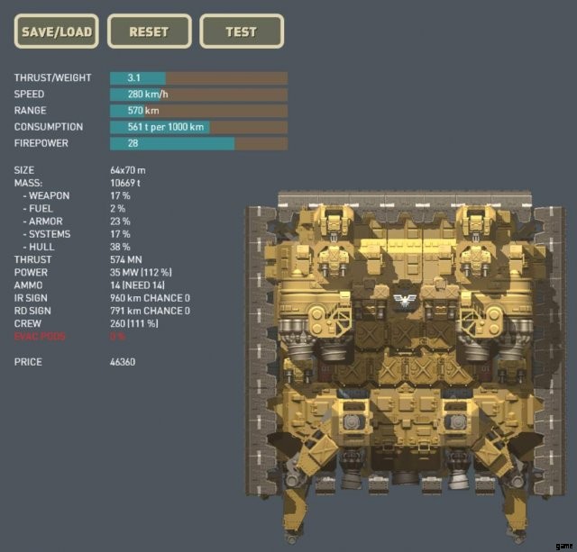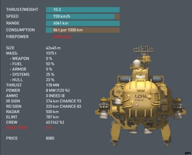 結果については、スクリーンショットを参照してください。私が遊んでいる最初のイテレーション Mk.1 は、82K で安く、速度は 275km/h、航続距離は 5188km、消費量は 1000km あたり 925t です。各航空機タイプが 1 つずつ減り、戦術ミサイルは 8 基しかありません。 Mk.2 は、わずかに高いコストで敵グループの破壊を加速するためのものです。