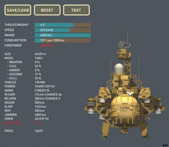 ここでの私の選択は、燃料消費を改善するために 2 つのスイベル エンジンのみを使用することでした。上に回避し、すぐに敵の下の側面に戻るのが最善です。気になる場合は、固定エンジンの代わりにスイベル エンジンを追加できますが、燃料消費が高くなります。