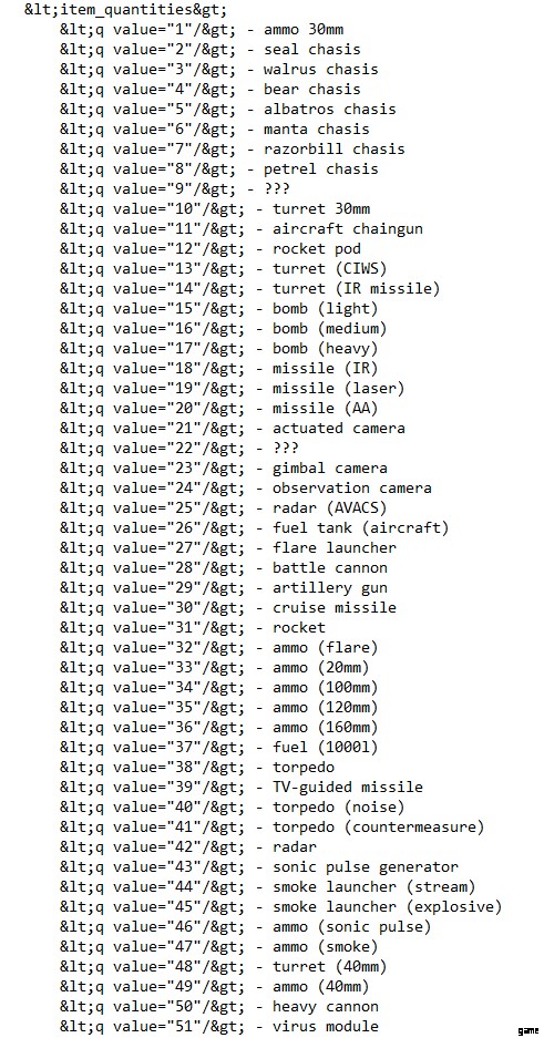 そして、あなたが探しているのは、行の数量のいくつかの値です。参照用に以下にアイテム ID のリストがあります。私の倉庫では ID 46 です。あなたの倉庫は異なります。あなたがやろうとしているのは、次のいずれかをコピーして貼り付けることです。これらの を変更して、I はアイテムを表し、Q は数量を表すので、20mm 弾薬 2000 が必要だとすると、次のようになります