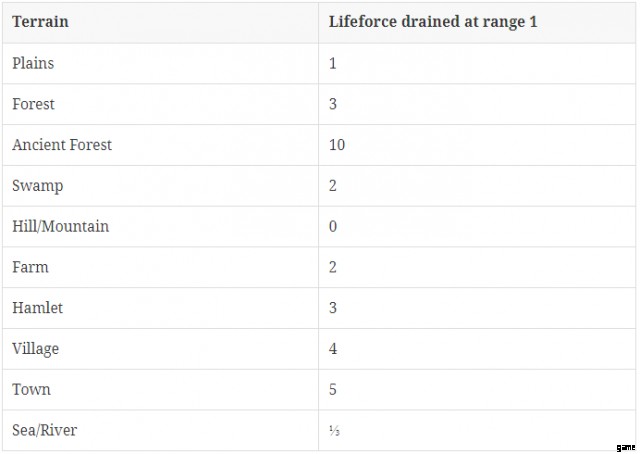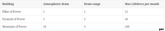 周囲の地形から生命力を蓄積するために、特別な力のある建物が使用されます。建物によって、吸収できる範囲が異なり、1 か月あたりに排出できる最大量も異なります。建物は、地形に関係なく、空気から少量の生命力を生成します。