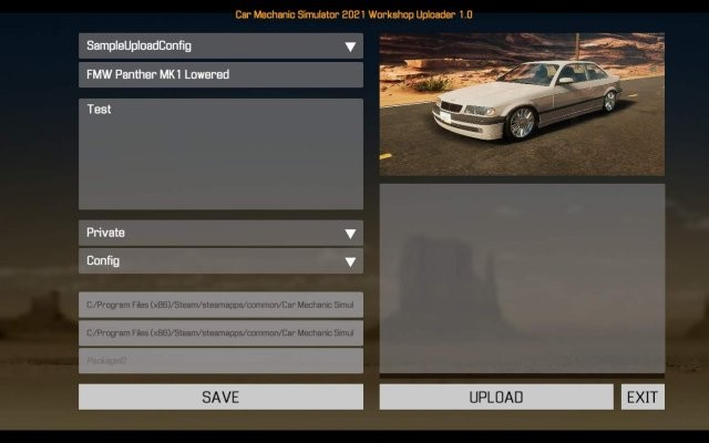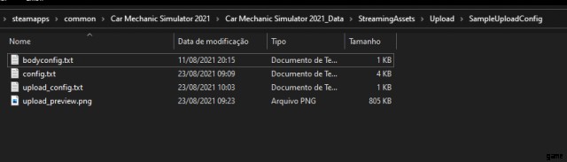 - Steam->steamapps->common->Car Mechanic Simulator 2021->Car Mechanic Simulator 2021_Data->StreamingAssets->Upload->SampleUploadConfig