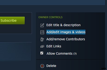 Go to your workshop, open the mod and hit “Edit title &description” and “Add/edit images &videos” in the left column.