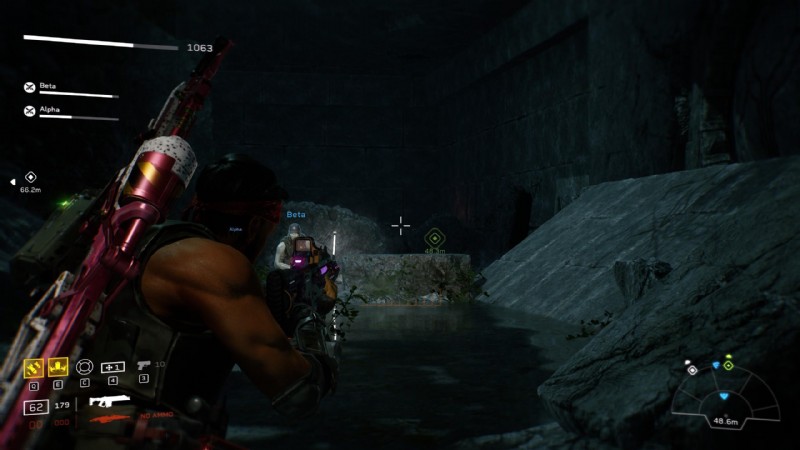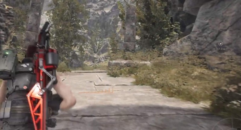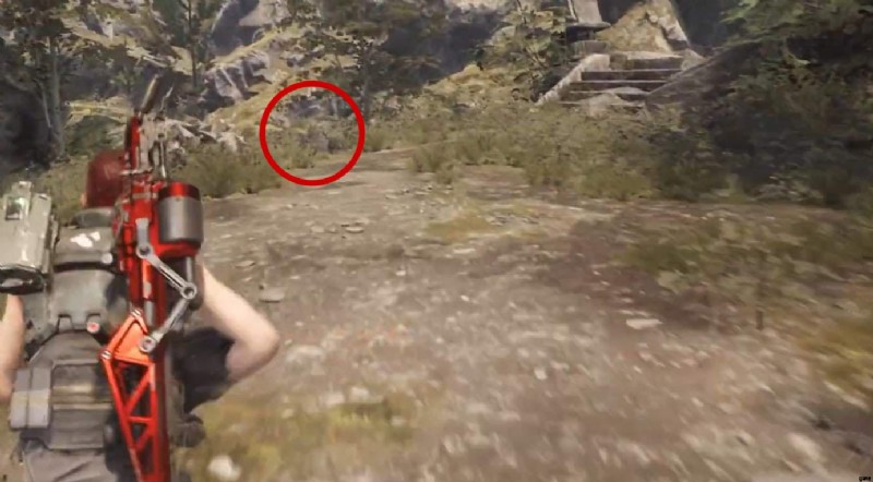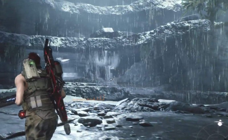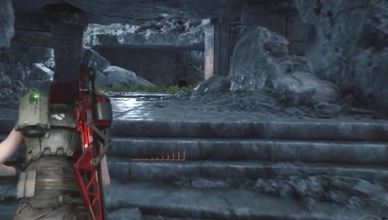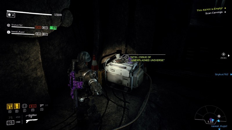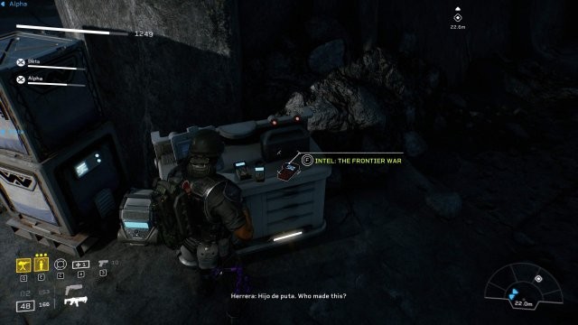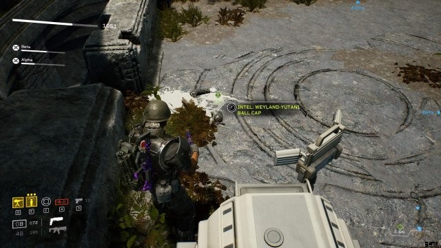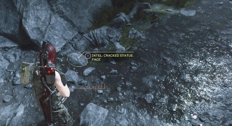- グリフを使用した科学者のメモ: 中央に細い通路がある部屋を出ると(弾薬箱もあります)。このインテルを見つけるには、すぐ左にある岩棚をマントで越えてください。
