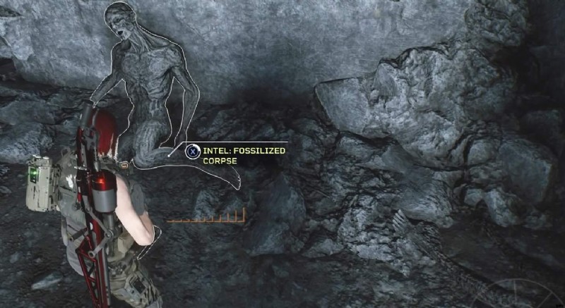 - Fossilized Corpse :When you reach a region with petrified corpses and a road leading straight ahead and to the right, turn left while staying close to the left wall. Your next piece of intelligence is to the right of that.