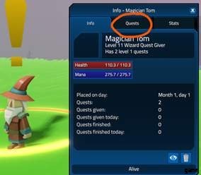 クエスト提供者を世界に配置し、NPC をクリックして [情報] メニューを表示します。利用可能なクエストを表示および変更するには、[クエスト] タブを選択します。