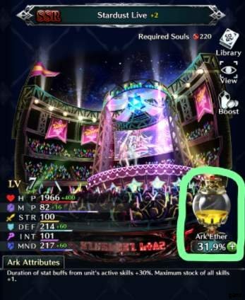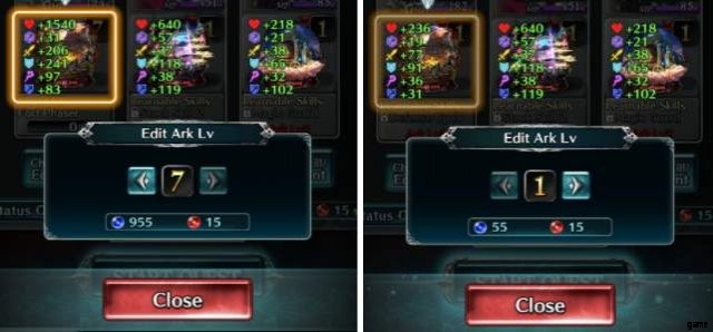When grinding Ark Ether, it is very important to remember to lower your Ark Level to 1 if you have leveled it up, using the “Edit Ark Lv” button when editing a team. This is so that you don’t accidentally waste all your Red or Blue souls while auto-running for a long period of time, as the higher the Ark Level the more souls it takes to use it. Notice the difference?