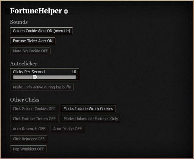 FortuneHelper は Cookie Clicker の Steam バージョン用に作成した mod です。完全に設定可能で、いくつかの便利な機能が含まれています: