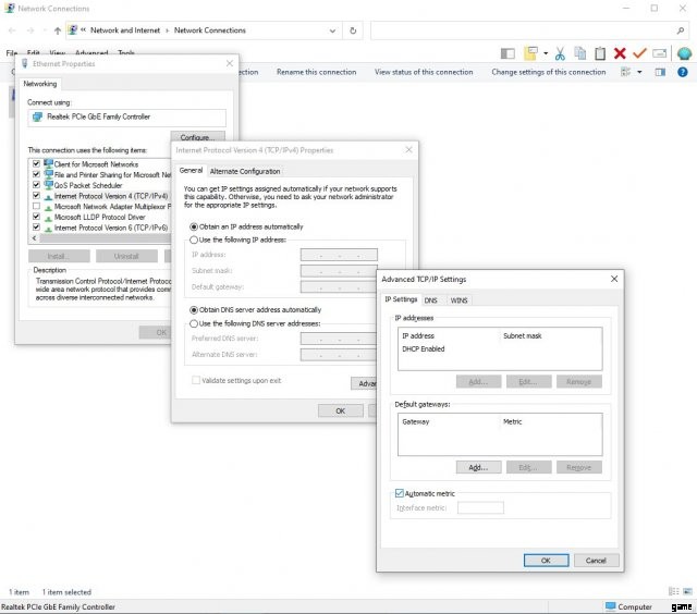- 4.詳細タブを開き、「自動メトリック」のチェックを外し、「インターフェース メトリック」を 1 に変更します
