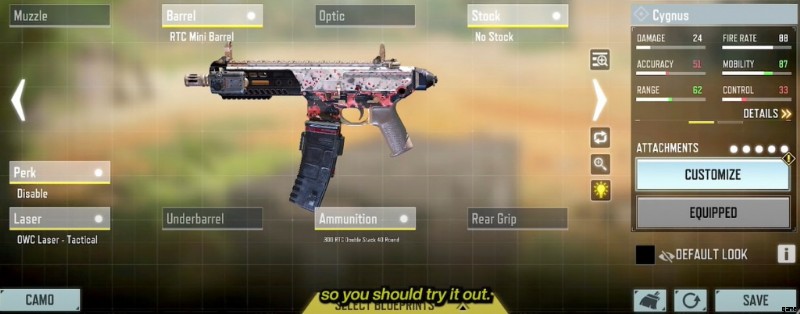 最初のアタッチメントは RTC Silence Barrel です 、ステルス性能と最適な機動性のための内蔵サイレンサーが付属しています。また、反動制御 (+1.6%) と ADS の弾丸拡散 (+8.2%) のわずかな犠牲にもかかわらず、ADS 時間を 7% 短縮します。