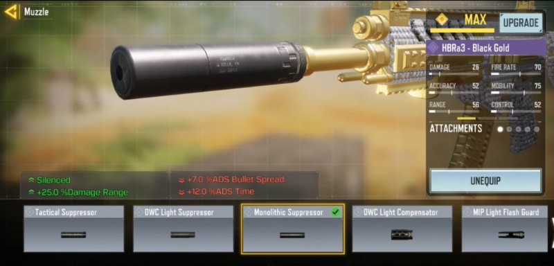 最初のアタッチメントは モノリシック サプレッサーです 敵からあなたを隠し、ダメージ範囲を 25% 増加させます。ただし、このアタッチメントは、7% の ADS の弾丸拡散と 12% の ADS 時間の犠牲になります。
