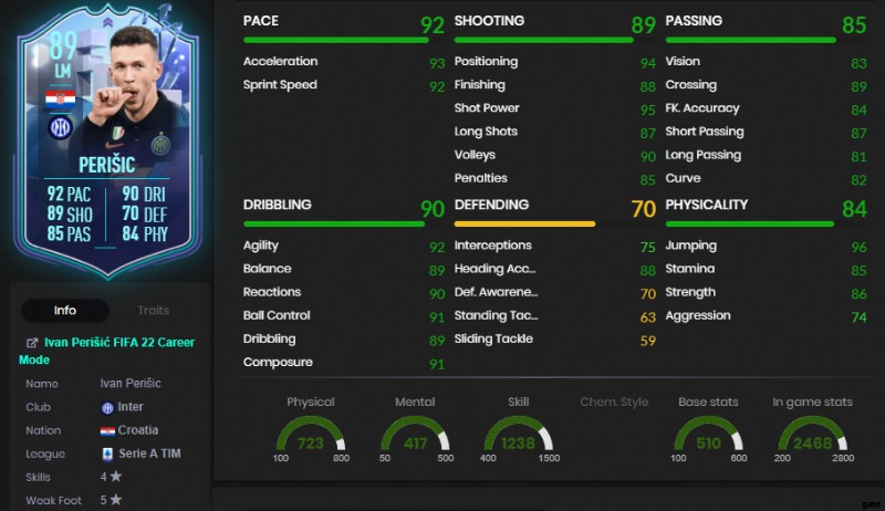 以下のIvan Perisic FUT Fantasyのスタッツをご覧ください。彼のハイライトには、93 アクセラレーション、92 スプリント スピード、95 ショット パワー、91 ボール コントロール、89 ドリブルが含まれます。