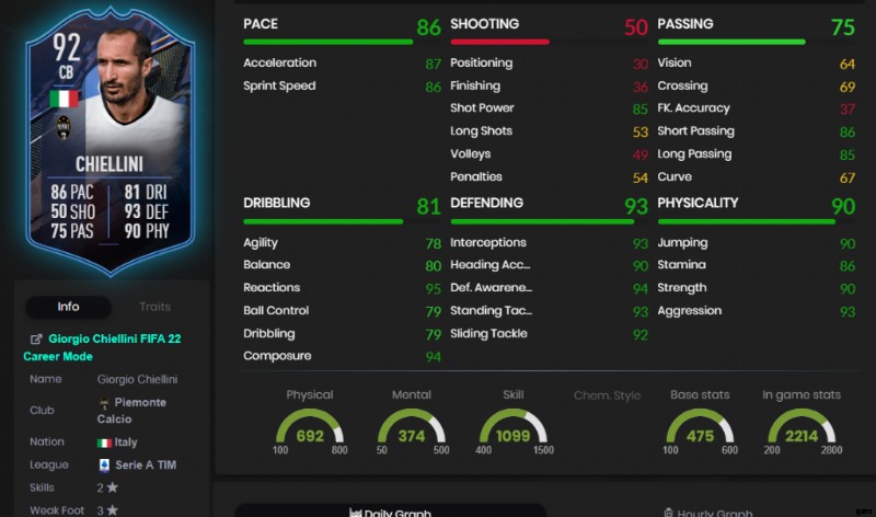キエッリーニ FUT キャプテン カードの統計にはいくつかの驚くべきピークがあり、適切な加速とスプリント スピードがあり、両方で 80 台後半に達していますが、さらに重要なのは、ほぼ完璧な防御統計です。
