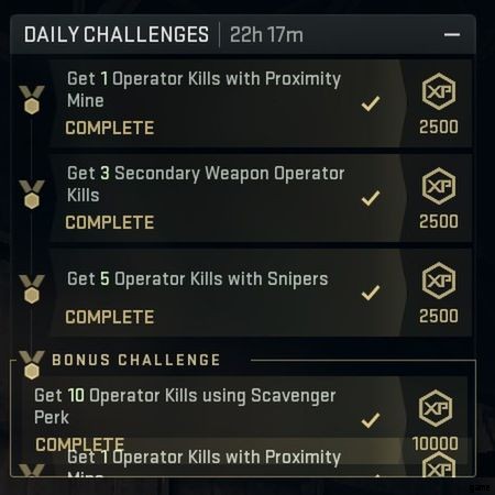 3 つのデイリー チャレンジをすべて完了すると、ボーナスのデイリー チャレンジが与えられ、完了すると 4 倍の XP が得られます。 これらの課題は少し時間がかかりますが、それだけの価値があります。 XP 報酬は次のとおりです: