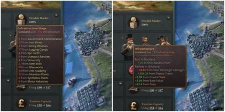 建物にはインフラストラクチャ コストがかかります 拡張されるにつれて増加し、州には、港と鉄道の 2 つの異なるタイプの建物に依存するインフラストラクチャの制限があります。 .港はインフラストラクチャに少し貢献しますが、大部分は鉄道からもたらされます。