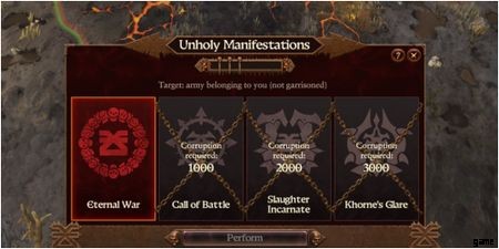 All Chaos Daemon factions possess the Unholy Manifestations mechanic, whereby they may exorcise a powerful rite with a cooldown. Khorne's Manifestations require a certain amount of Khorne Corruption to unlock, and become enhanced when he is in Ascendance in The Great Game .