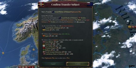 ドミニオンを作る | 対象国があなたの領土になります。ドミニオンは、オーバーロードの戦争に参加する必要はありませんが、毎週の国庫収入の 10% を支払うサブジェクトです。 |