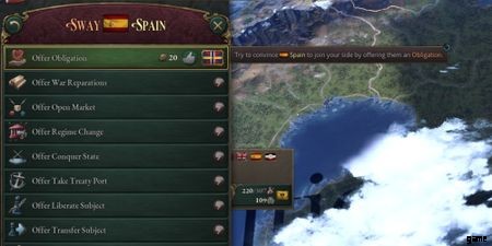このプロセス中に戦争目標を追加し、国を味方につけようとすると、機動が必要になります .操作できる操作の数は、パワー ランクと名声によって異なります。戦争の目標とスウェイの試みの両方が同じ操作のプールを使用することに注意してください。そのため、多くの戦争の目標を追加すると、より多くの味方を獲得する機会が少なくなります.