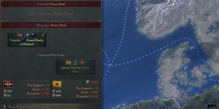 敵の戦争目標の一部またはすべてに同意できることに注意してください 、それらがあなた自身のものに直接干渉しない限り。旗の横にある受け入れレベルからわかるように、これにより彼らは和平協定を受け入れる可能性が高くなります。