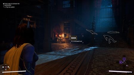 右側の部屋には、他の秘密のボタンが含まれます。この部屋には、さらに手下が待っているでしょう。繰り返しになりますが、発見されても問題ありませんが、探索する前にすべての敵を倒した方が簡単です.それらがすべてノックアウトされたら、画面にレチクルが表示されるまで AR スキャン ボタンを押し続けます。 階段の左側にある本棚を狙うと、くり抜かれた本が現れます .近づいてボタンを押すと、メカニズムが作動します。