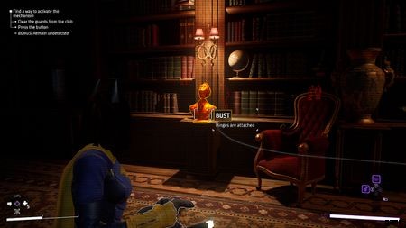 他の部屋に入るには、任意の数のドアを使用してください。最初の秘密のボタンは左の部屋で待っています . ここには、こっそりと簡単に対処できる手下が 3 人います。それらがノックアウトされたら、画面にレチクルが表示されるまで AR スキャン ボタンを押し続けます。 階段に近い胸像に向けてください .スキャンすると、中にボタンが表示されます。ボタンを押して、別の部屋に向かいます