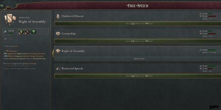 あなたの権限は主に法律に由来します . 法律が厳しくなればなるほど、政府に与えられる権限も大きくなります 、これは使用するより多くの権限に相当します。 ランダムなイベント、テクノロジー、人気など、権限を高める方法は他にもあります 、しかし大部分はあなたの一連の法律から来ます.