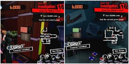 You’ll see colored terminals around the room. Keep them in mind as you ultimately head to the door in the west that brings you to a giant slot machine. It’s tempting to play, but you know the last game was rigged, so don’t do it yet. Instead, inspect the back of the machine . Climb up it and listen to Futaba tell you which terminals you’ll need.
