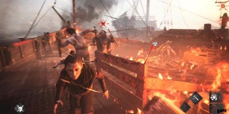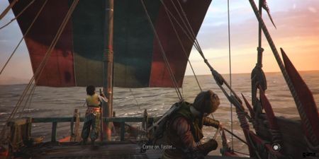 メイン デッキに戻り、右側の帆で再びアルノーをアシストします。 船を速く動かす。 2 人は貨物を船から投げ落とそうとしますが、射手が火の矢を雨のように浴びせ始めます。