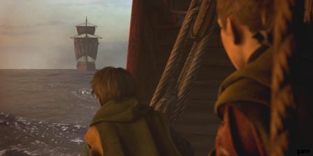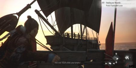 全員と話し終えると、ソフィアは彼らの後ろに伯爵の船を見ます。一番上の甲板への階段を駆け上がり、アルノーが左側の帆を調整するのを手伝ってください .