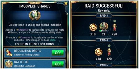 特定のキャラクターに必要なものを見つけるには、メインのキャラクター画面でそれらをクリックするだけです.名前のすぐ下に、円形のボックスに頭の小さな画像が表示されます .これには下に数字があり、次のアセンション レベルに向けて持っているシャードの数を示します。画像をクリックすると、それらのキャラクターのかけらをどこで入手できるかを示すボックスが表示されます。多くはキャンペーン レベルを通じて入手できます。そうである場合は、この画面のレベルをクリックするだけでそのレベルに移動できます。レイド チケットをお持ちの場合はそれを使用できます。
