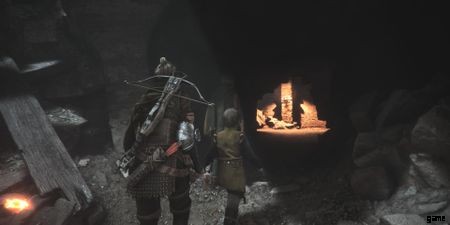 カットシーンの後、左の壁からトーチを拾います 煙を避けて、ネズミの間をゆっくりと丘を下っていきます。 左の道を下って坂道を上ると暗いトンネル。 左側に別の袋があります 、右側の壁の近くにとどまります。パスの終わりに到達すると、カットシーンで地面の真ん中に巨大なネズミ嚢が表示されます。