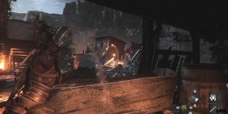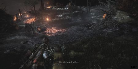 左側に向かい、トーチの近くに壊れたワゴンを見つけます.周辺には敵がパトロールしているので、近くの背の高い草を利用して隠れましょう。 ワゴンの側面にボルトがあります 兵士を攻撃することを選択した場合。
