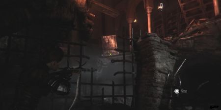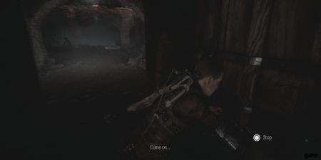 エリアを歩き続けると、アンカーポイントにアクセスできます。 大型ワゴンにロープを発射 上の階からぶら下がってから下に引っ張ると、開口部の下の壁に向かって転がります .残念ながら、勢いが強すぎて壁に引っかかってしまいます。ワゴンとやり取り アミシアとルーカスが開口部に押し込むと、ネズミがはびこる開口部ができます .