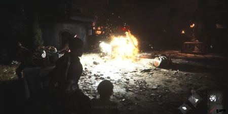 カットシーンの後、棚から降りて、鐘楼が崩壊するのを見た後、次の芝生への道を進み続けます .この地域にはより多くの兵士がパトロールしているため、ここでも、隠れ続けるか攻撃するかを選択できます。あなたが攻撃すると、最初の兵士はヘルメットをかぶるので、Extinguis を使ってトーチを消し去ります。 ネズミに対処させてください。