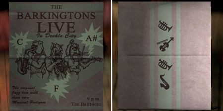 上の写真の例では、ポスターがシロフォン ロックの暗号として機能します。シーケンスはトランペット、バイオリン、トランペット、サックスなので 、正しい音符は F、A#、F、C です。