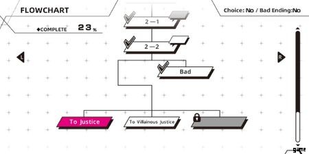 最後のルートはロックされたままになり、共通ルートの最初のフローチャートから正義と悪役の正義のルートにつながるパスの横に表示されます。