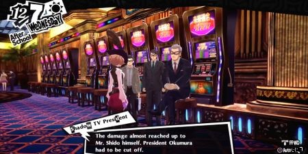 中に入ったら、階下に行ってスロット マシン ルーム (北に向かうと宝箱があります) を見つけ、次に階下に戻って次の戦いを開始します。 テレビ局の社長 は自分の影に加えて 2 つのガルーダを使用してあなたと交戦するので、上記のアフィニティ テーブルを使用してすばやくそれらを取り除きます.