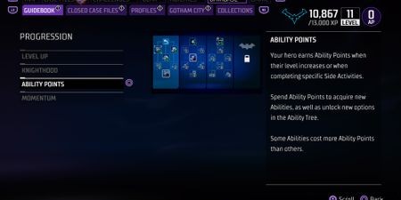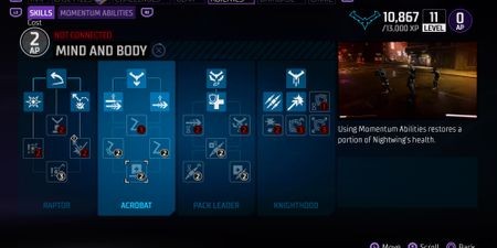 スキルをアンロックするには能力ポイントが必要です。これはナイトウィングをレベルアップすることで獲得できます .ストーリーミッションを完了し、ゴッサムで犯罪を解決することで、彼をレベルアップできます. ロックを解除しようとしている各スキルには、一定量の AP (能力ポイント) があります そうする必要があります。