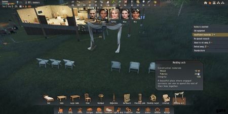 To hold a marriage ceremony for your engaged survivors, you must build a wedding arch first. You can task a survivor with building an arch via the furniture menu. You'll see it next to the armchair icon. Constructing a wedding arch requires ten pieces of wood and twenty fabric.