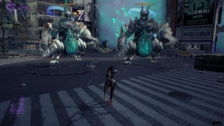 ベヨネッタは移動中の電車の中で新しい世界に到着します。ストラタスの敵の群れがすぐに現れ、あなたはそれらを倒さなければなりません.カットシーンがトリガーされ、街中のテンポの速い追跡シーケンスでゴモラをコントロールします 、電車や倒壊する建物を避けます。 Asperatus との戦いとクイック タイム イベントの後、安全に東京:渋谷に着陸します。 .