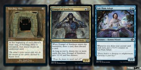 青と黒の両方が得意とすることの 1 つは、たくさんのカードを引くことです。そのため、青/黒のアーキタイプは、毎ターン少なくとも 1 枚余分にカードを引くことに対して報酬を与えます。 合成の福音者の道しるべ カードを引くたびに +1/+0 と威迫を得るファイレクシアのヒューマン クレリック。これは以前に他の色で見たアーキタイプです。特にエルドレインの王権の青/赤の色です。