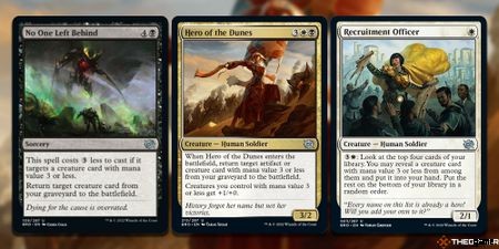 The signpost for Recursive Aggro is Hero of the Dunes , who emphasises one key aspect of the archetype:you’ll want lots of creatures with mana values less than three. Things like Thraxodemon, Thran Vigil, Ambush Paratrooper, Airlift Chaplain, Powerstone Engineer, and Recruitment Officer make good choices for it.