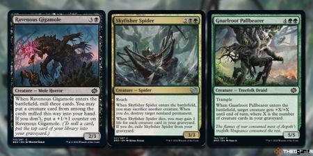 Black and green are sticking to the old Golgari classic:graveyard decks. It’s something the colours do in almost every set, and this time it’s being signposted by Skyfisher Spider , which helps you gain massive amounts of life when it dies depending on how many creatures are in your graveyard.