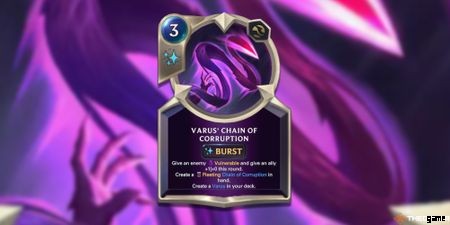Varus のチャンピオン スペルは Varus's Chain of Corruption です .これは敵ユニット1体と味方ユニット1体に加えて1回の攻撃を与える3マナバースト呪文です .さらに、使用後に自分自身のフリーティング コピーを作成します。 、したがって、この呪文は、与えられたターンにマナが許す限り何度でも使用できます。