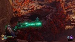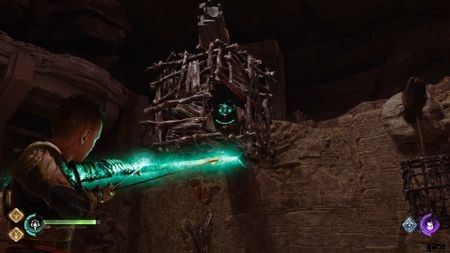 ここからメインの道をたどってください。 Angrboda をたどっていると、赤い胸に出くわします (見逃すのは難しい)。 Grylaの家の周りに着いたら、登って周りを回る必要があります.穴の開いた巨大な檻が上からぶら下がっています。穴から矢を放ち、反対側の緑の石に当てます。これで檻が落ち、Angrboda が起き上がるのを助けます。