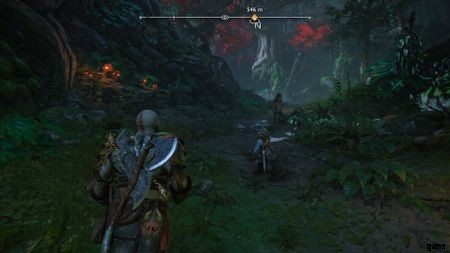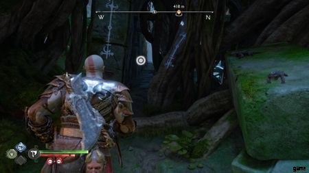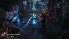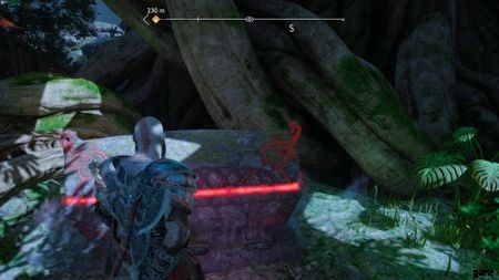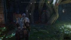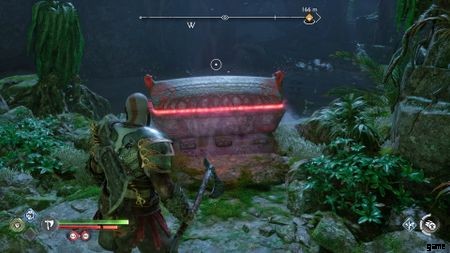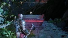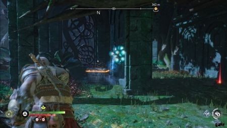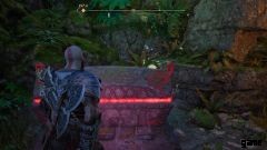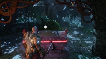 先に進むと、ノルニルの宝箱に出くわします。最初のターゲットは左側にあります。 Cのように見えるルーンが表示されるように、斧を投げて回転させます。次のターゲットは胸の右側です。それをブロックしている茨を燃やし、N のようなルーン文字が見えるように回します。 最終目標は、このエリアに入ったところに戻ってきました。後戻りして見上げると、それが見えます。これもイバラに覆われていますが、Blades of Chaos では到達できません。ありがたいことに、イバラは左側に持ち越されます。それらをそこで燃やせば、火はターゲットに運ばれます。 Rのように見えるルーンが見えるようにターゲットを回します。宝箱を開けて、ホーン オブ ブラッド ミードを手に入れましょう。
