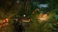 壁と生い茂った根の間の狭いスペースを押し進めます。進んで扉を開けると、そこは廃墟が立ち並ぶエリア。ここには、近づくと膨らむ有毒植物があります。必ず斧で倒してください。 遺跡の空き地に入ると右手に宝箱があります。 左側に進みます。 壁に穴が開いています。ここに伝説のチェストがあります! ひびの入ったスラブの上に立つまで進みます。あなたは敵のグループに襲われようとしています.