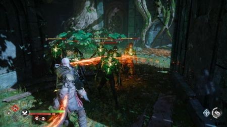 レギオンタイプの敵と戦うことになります。これらの緑色のグーンは非常に弱いですが、大量に発生します。彼らはブロックできない跳躍攻撃を持っていますが、かなり遅いです。距離を保ち、斧で群集をコントロールすることは、彼らに近づくための良い方法です.